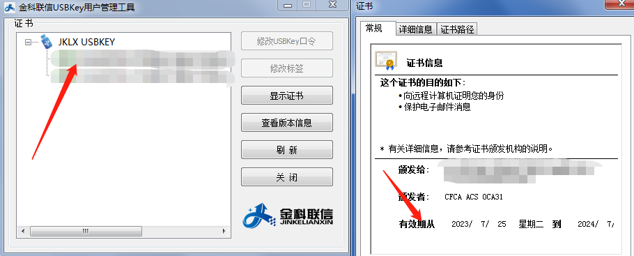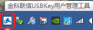 1、将我司的CA证书插入到电脑USB接口上,点击电脑屏幕右下角“金科联信USBKey用户管理工具”图标。