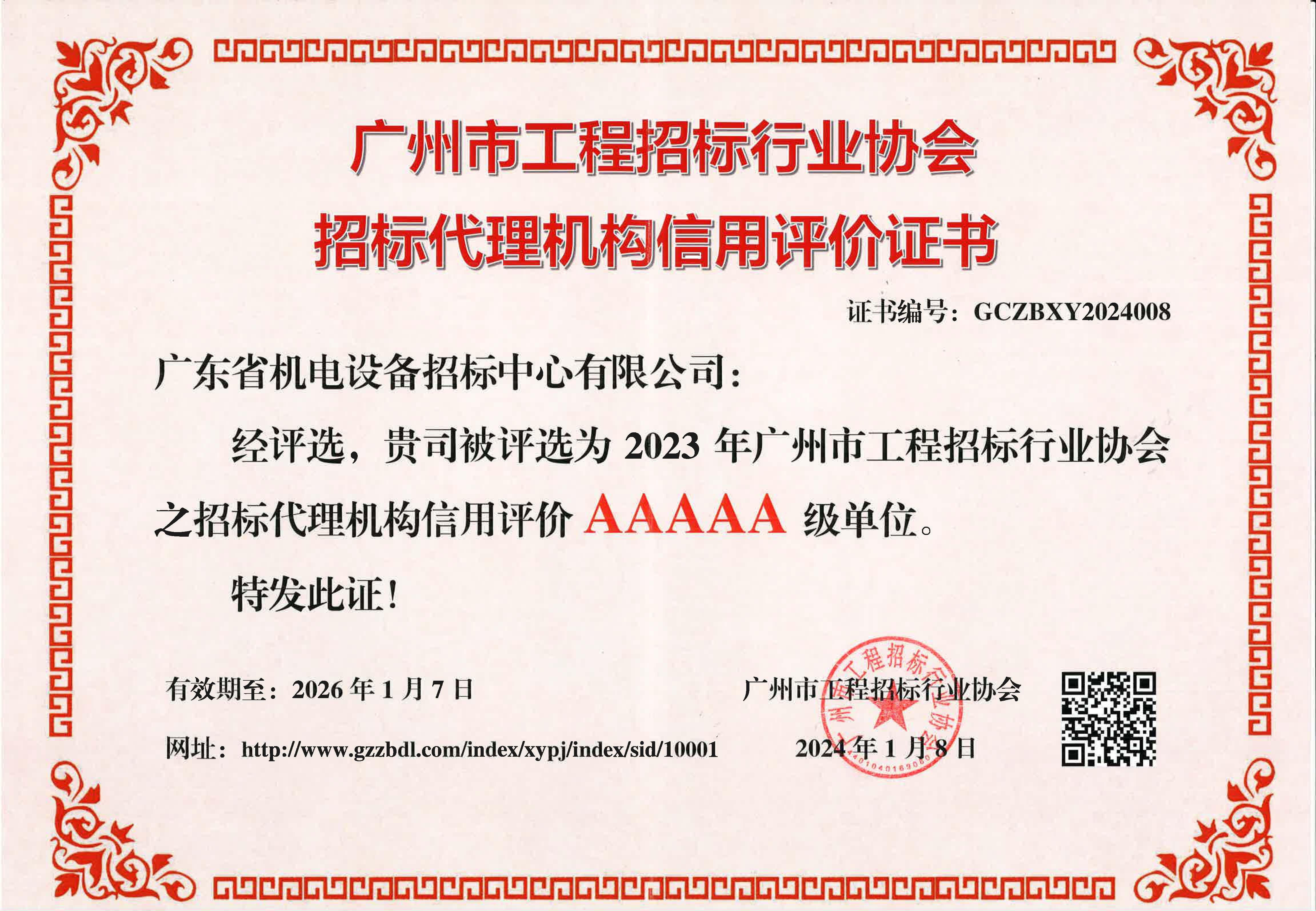 广东省招标投标行业招标代理机构信用评价证书(AAA级)